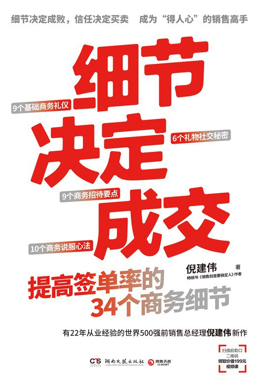 ISBN: 9787572613845 内容简介《细节决定成交》是经管畅销书作者倪建伟的新作。细节决定成败,信任决定买卖。作者认为,真正卓越的销售都是通过商务细节“得人心”,细节决定成交。有22年从业经验的销售总经理给你的34堂销售实战商务礼仪课,从基础商务礼仪、礼物社交、商务招待和商务说服四个方面帮你和客户有效互动,让每一次和客户打交道都能够助力成交。